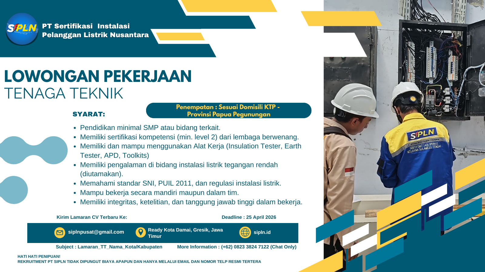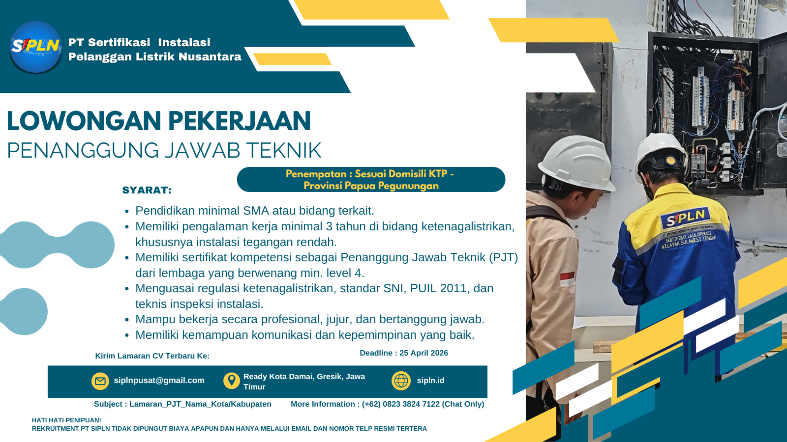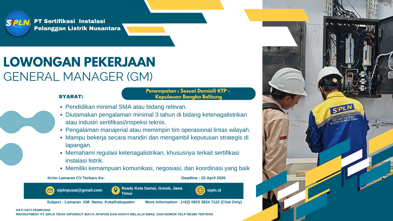 Kami Mencari Individu Terbaik Untuk Tumbuh dan Berkembang Bersama SIPLN Deadline 25 April 2026 - Kirim Lamaran CV Terbaru : siplnpusat@gmail.com - Subject : Lamaran_GM_Nama_Kota/Kabupaten - Informasi Lebih Lanjut Hub :+62 0823 3824 7122 Chat Only