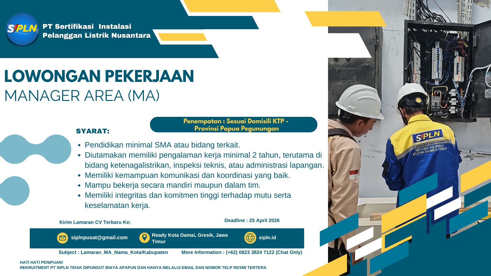 Kami Mencari Individu Terbaik Untuk Tumbuh dan Berkembang Bersama SIPLN Deadline 26 April 2026 - Kirim Lamaran CV Terbaru : siplnpusat@gmail.com - Subject : Lamaran_GM_Nama_Kota/Kabupaten - Informasi Lebih Lanjut Hub :+62 0823 3824 7122 Chat Only